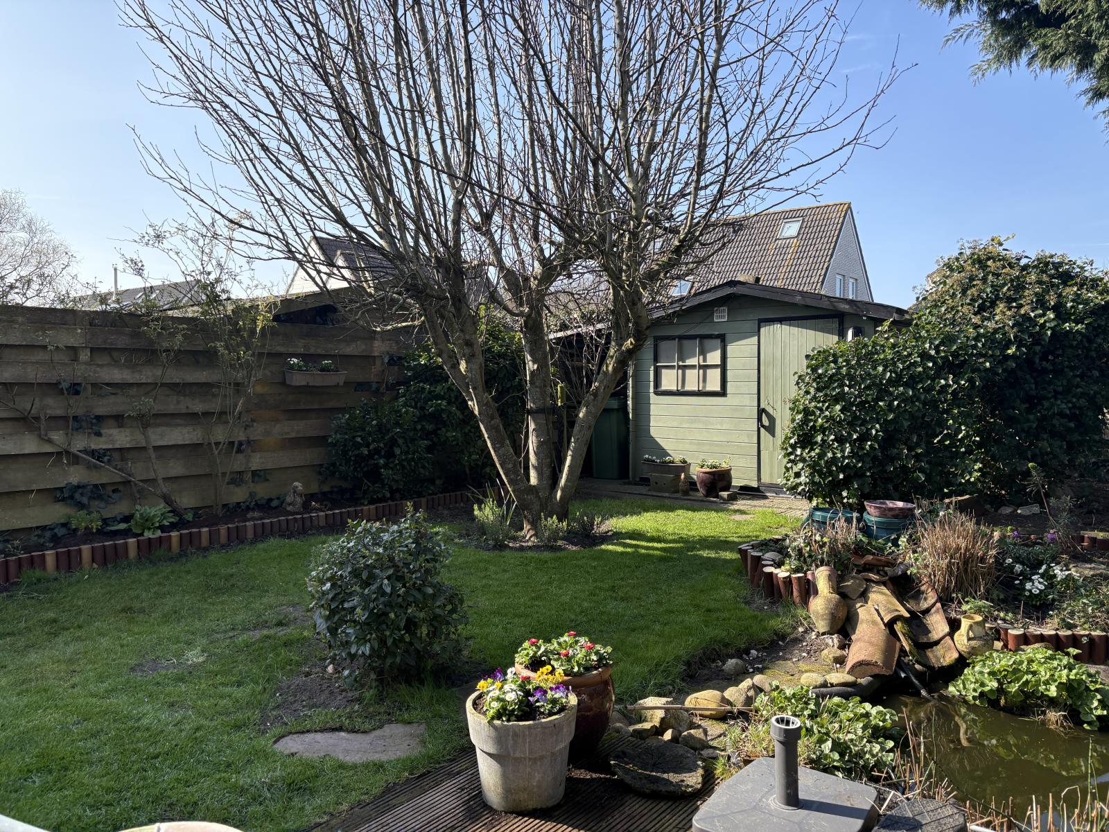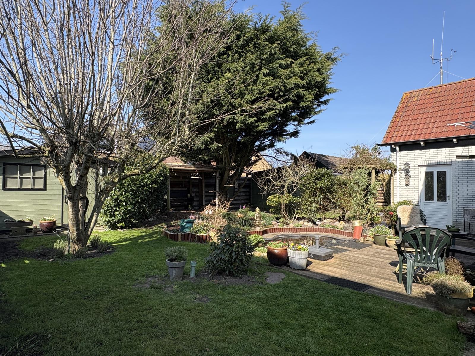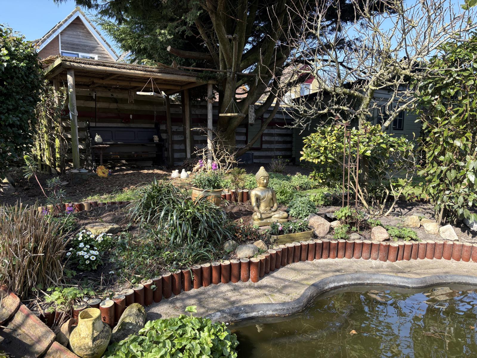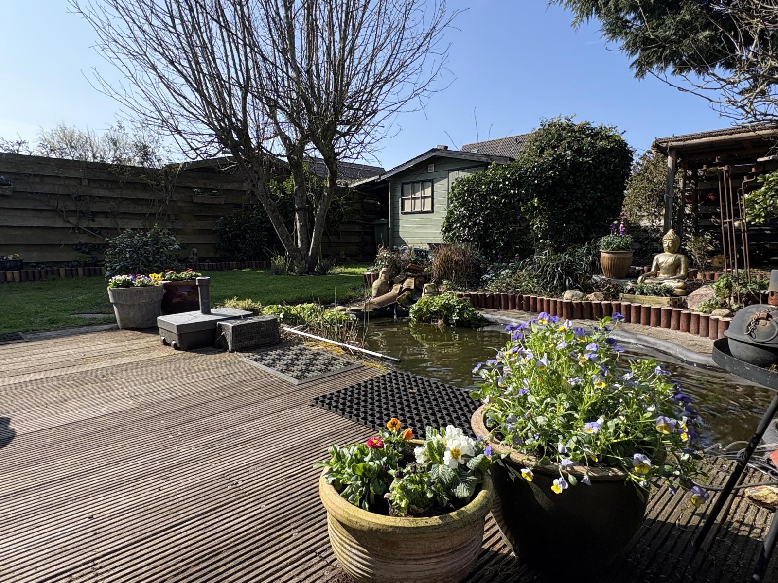 De op het zuidwesten gelegen achtertuin is een echte oase, fraai aangelegd met een vijver en volop zon. In de tuin bevinden zich ook nog twee houten tuinhuisjes.