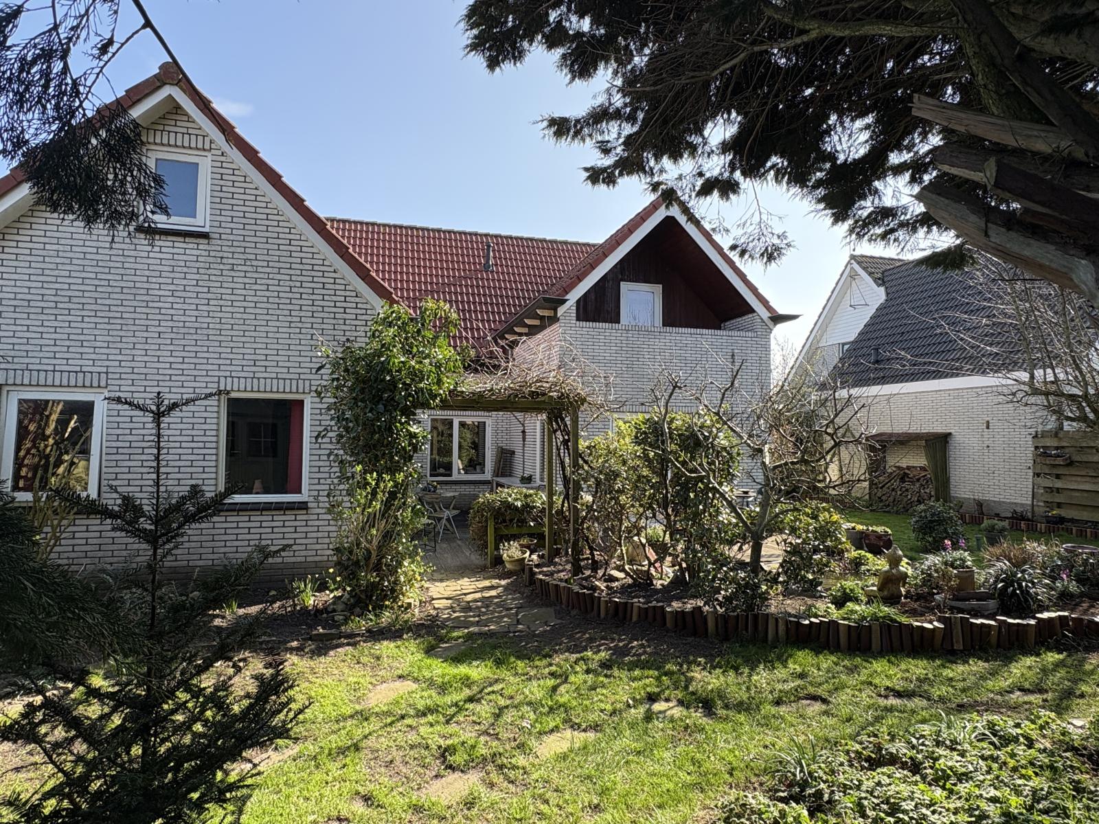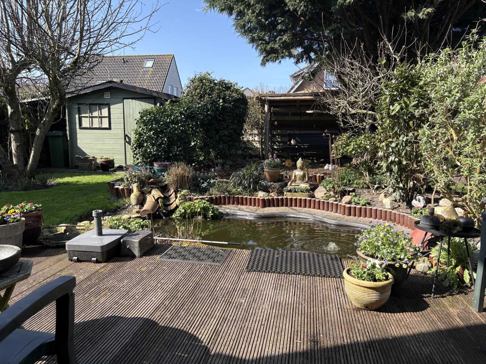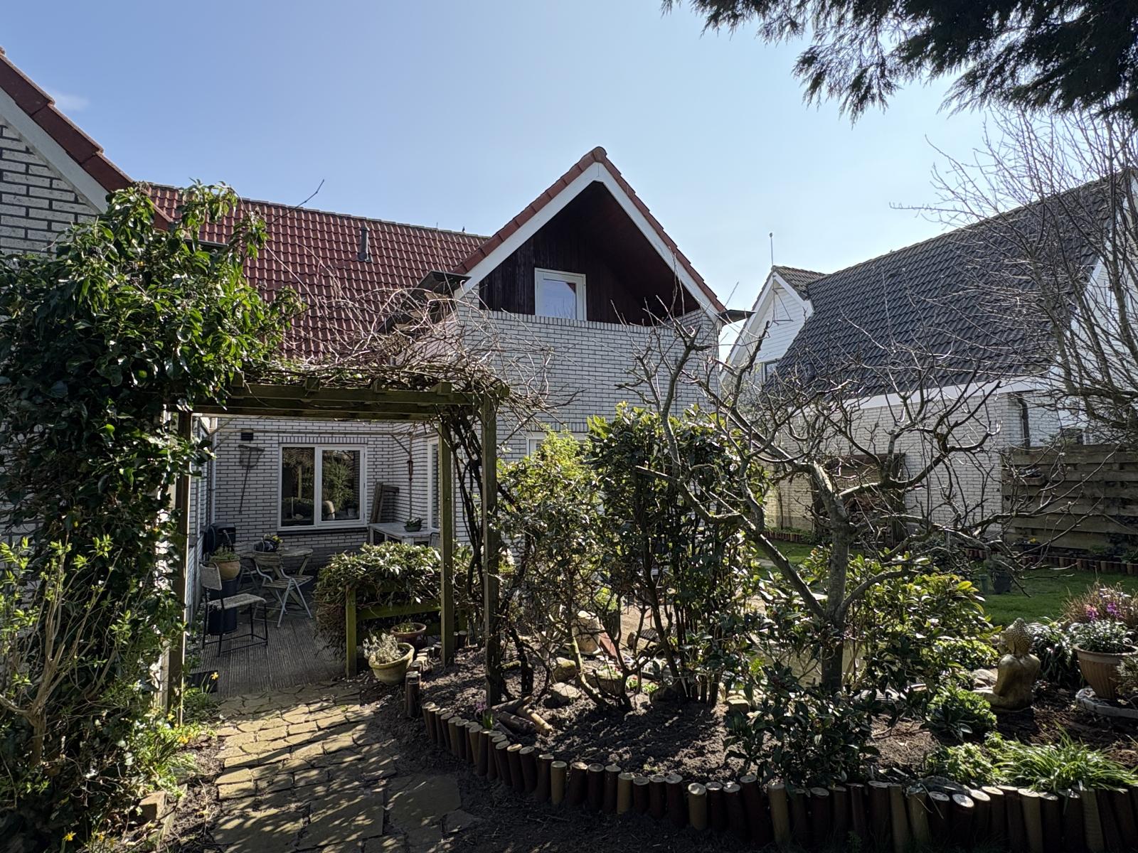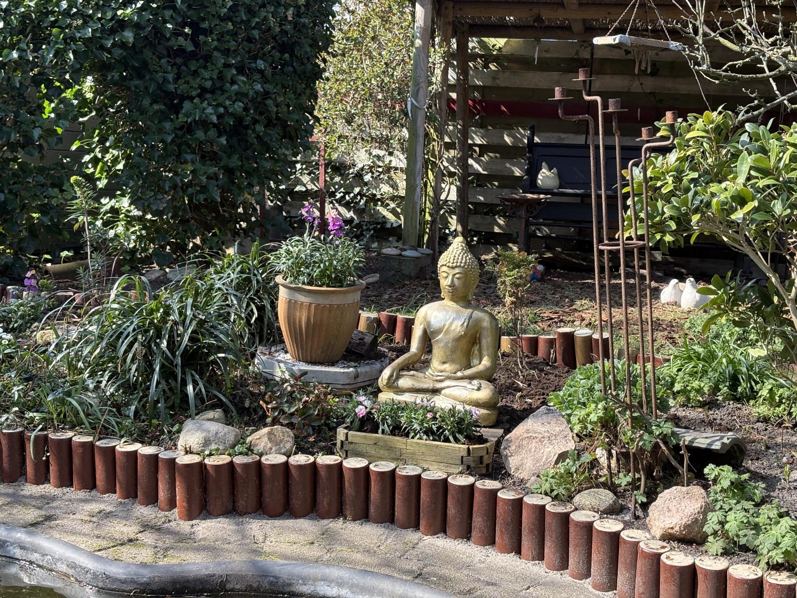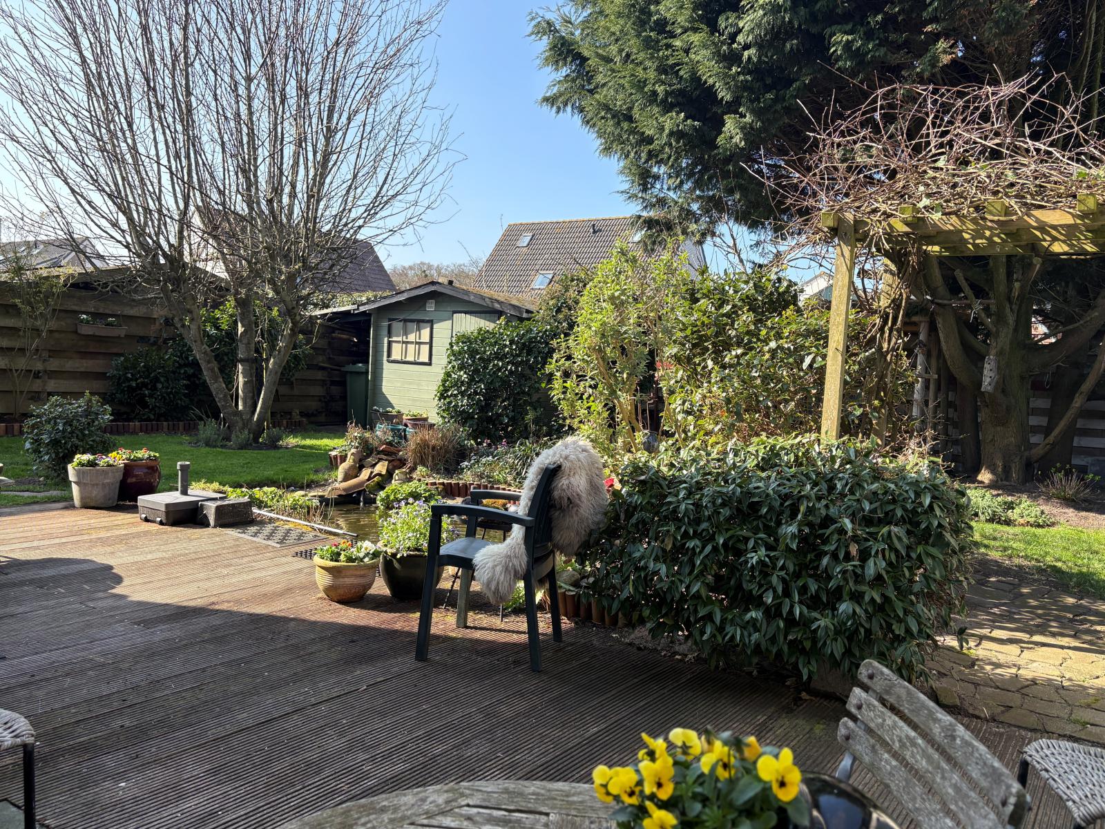 De op het zuidwesten gelegen achtertuin is een echte oase, fraai aangelegd met een vijver en volop zon. In de tuin bevinden zich ook nog twee houten tuinhuisjes.