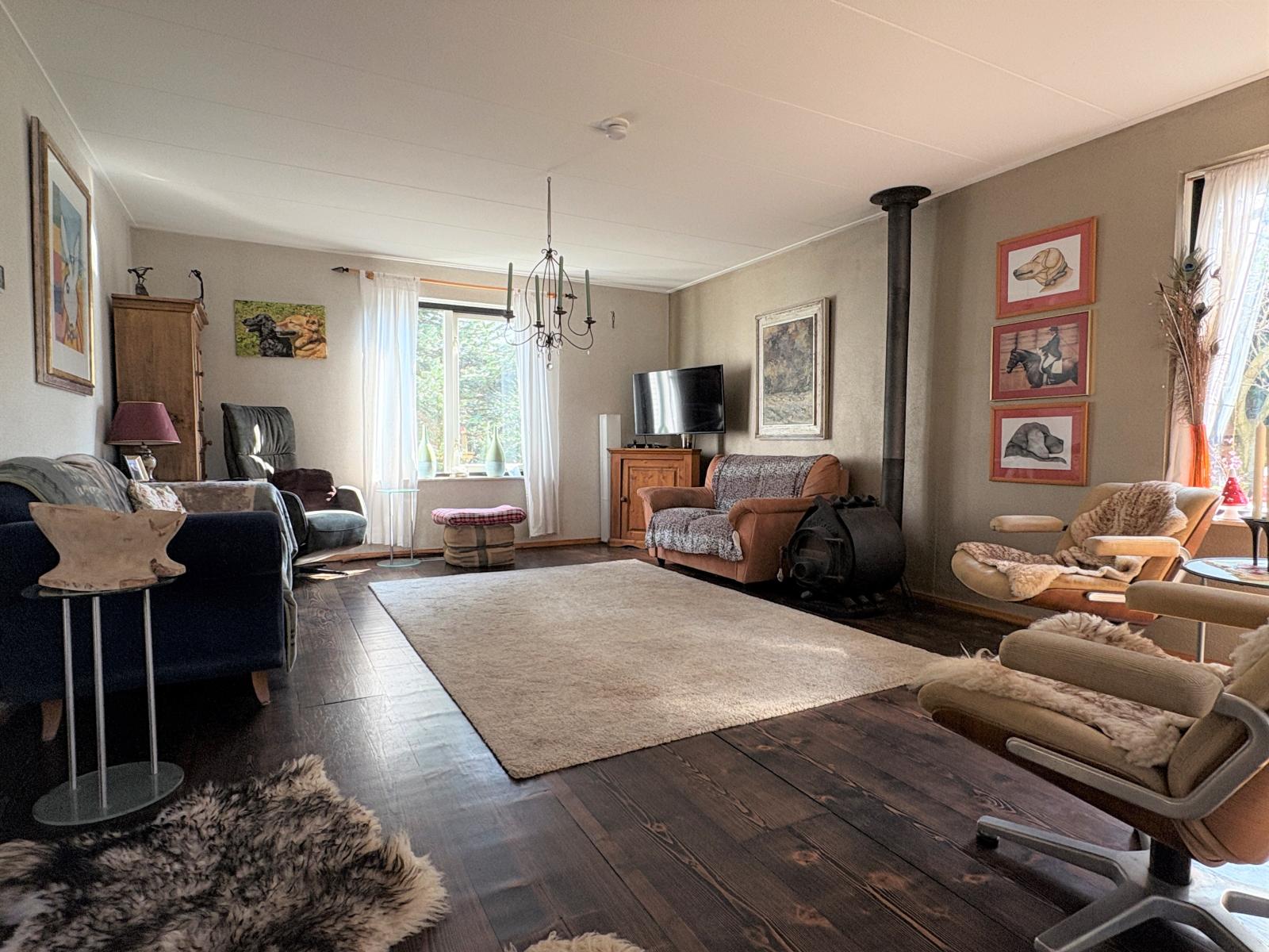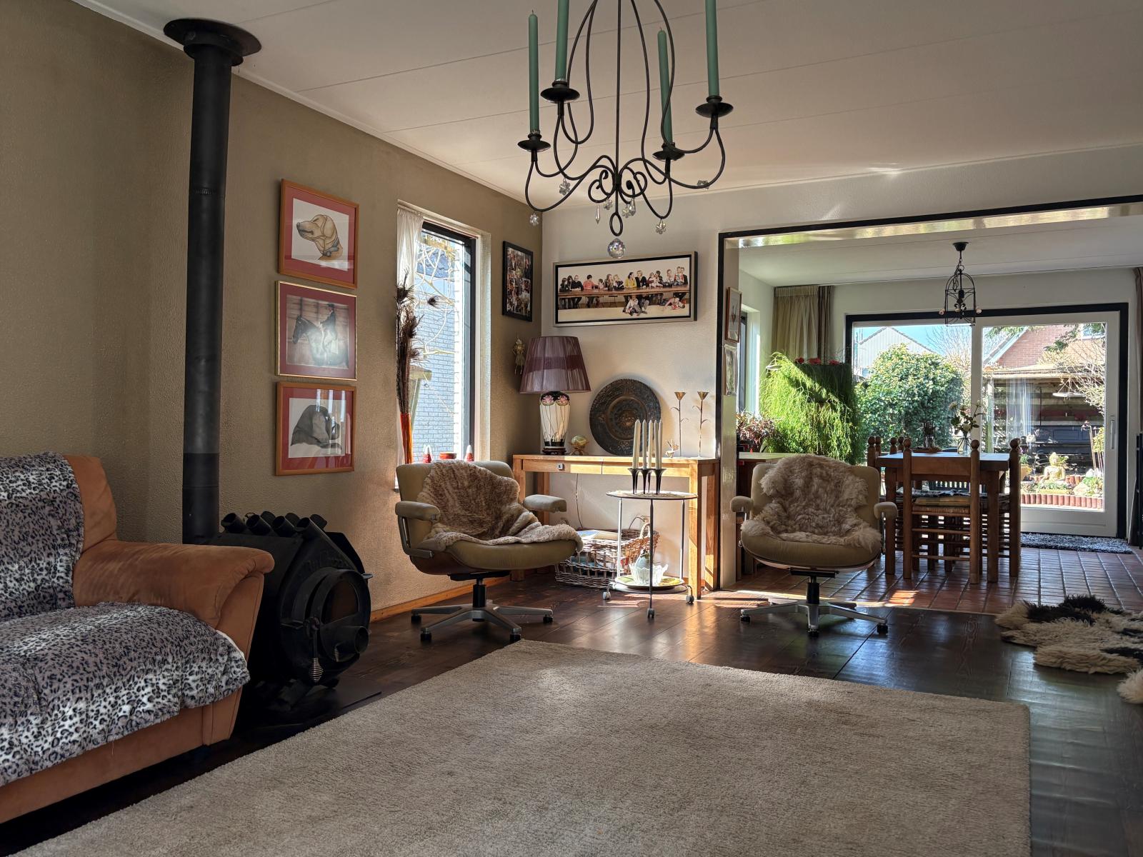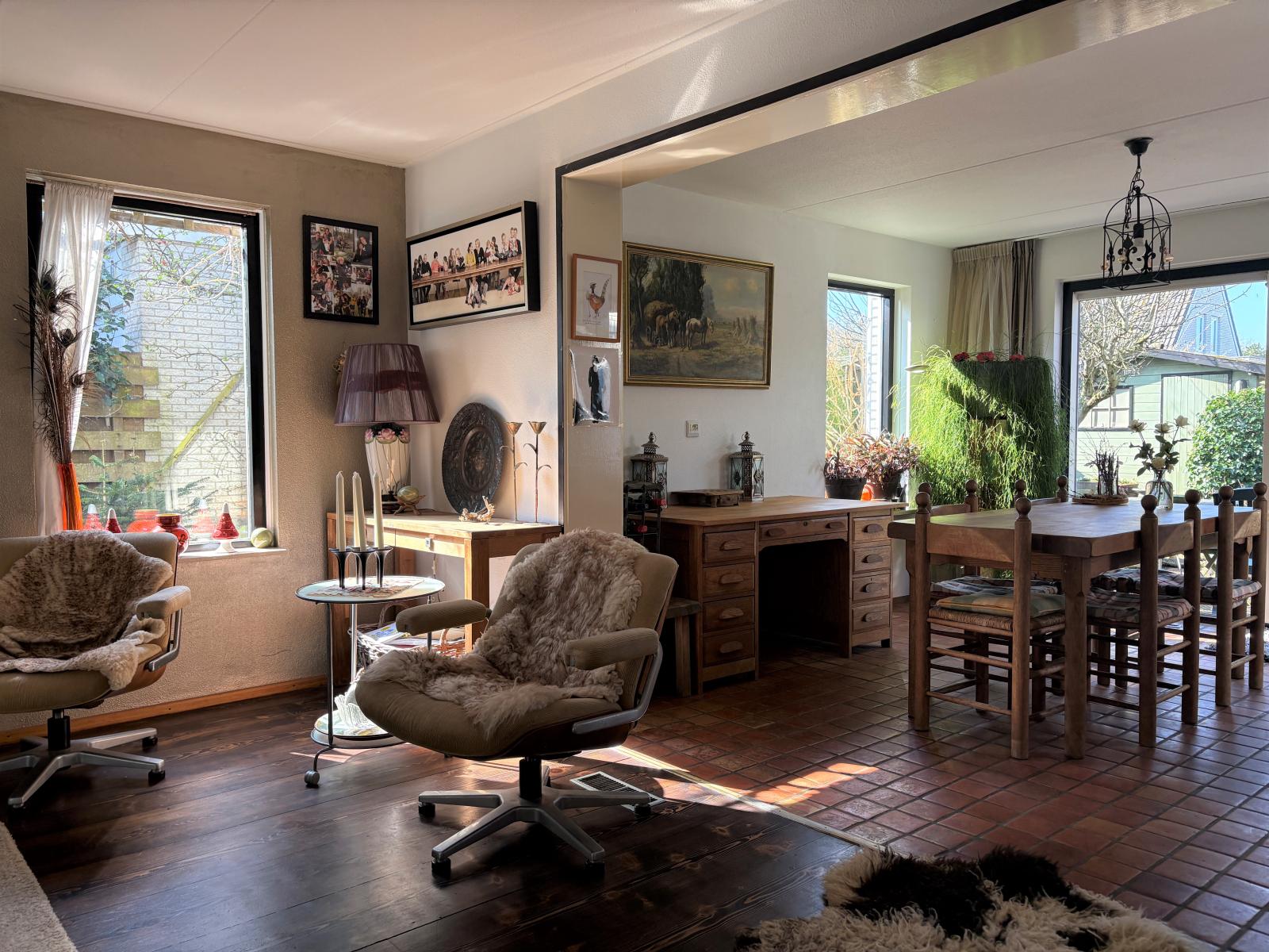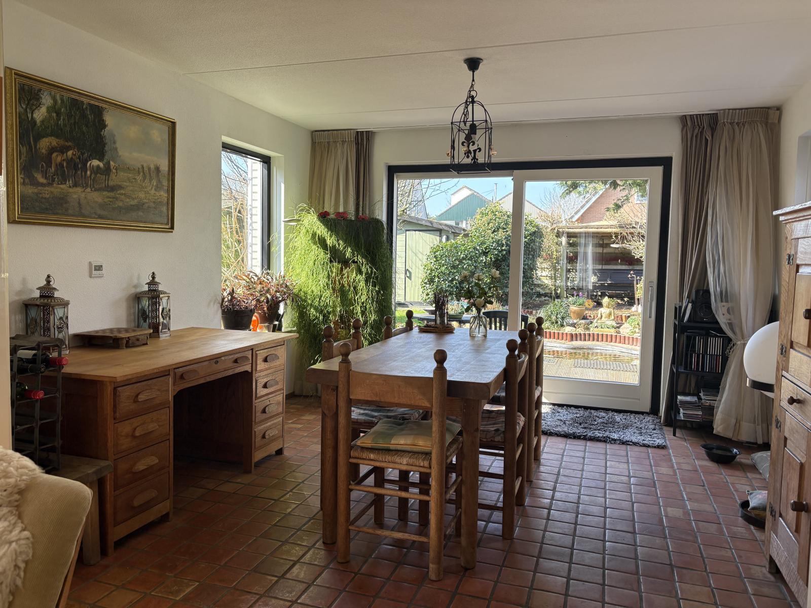 De ruime zithoek bevindt zich aan de voorzijde, terwijl de eethoek aan de achterzijde ligt en uitzicht biedt op de fraai aangelegde tuin, die via de schuifpui bereikbaar is.