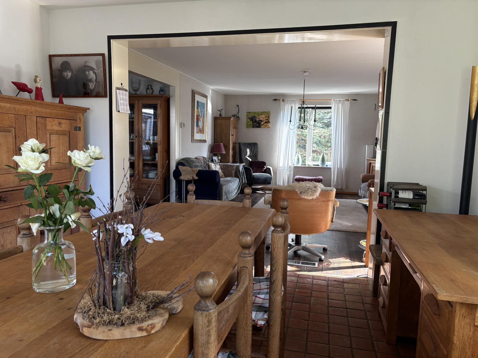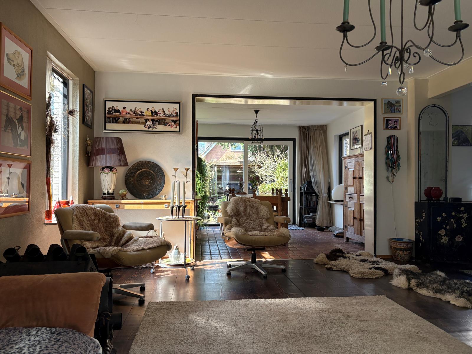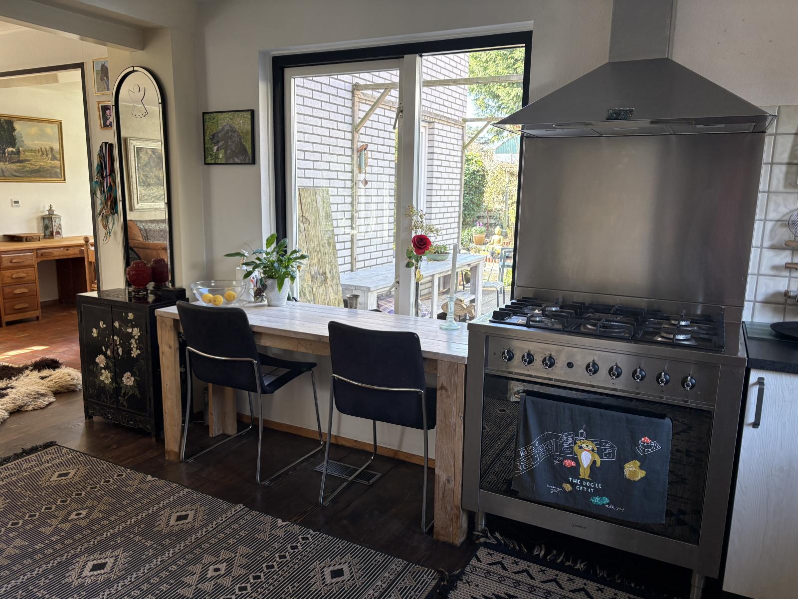 De ruime zithoek bevindt zich aan de voorzijde, terwijl de eethoek aan de achterzijde ligt en uitzicht biedt op de fraai aangelegde tuin, die via de schuifpui bereikbaar is.