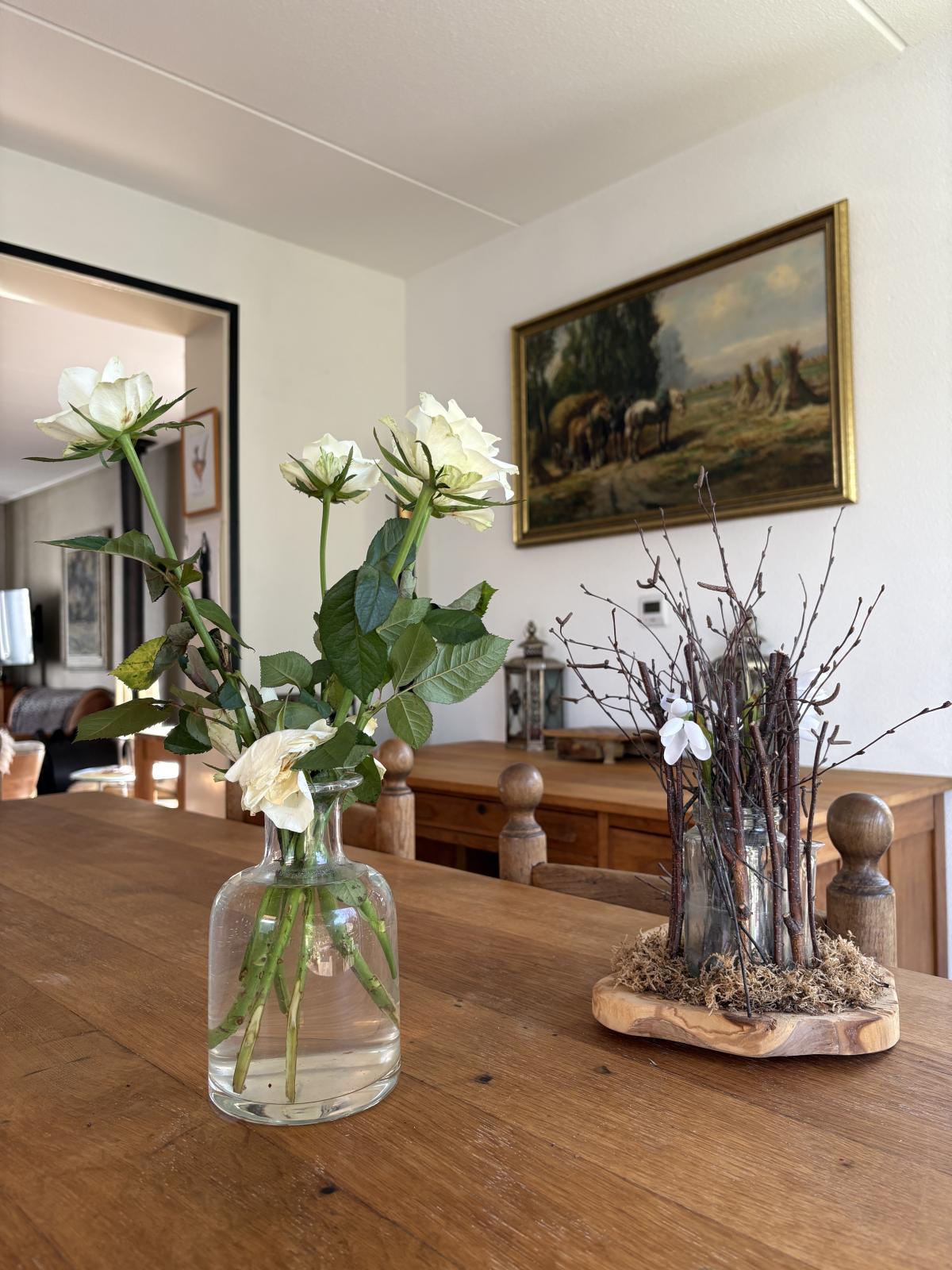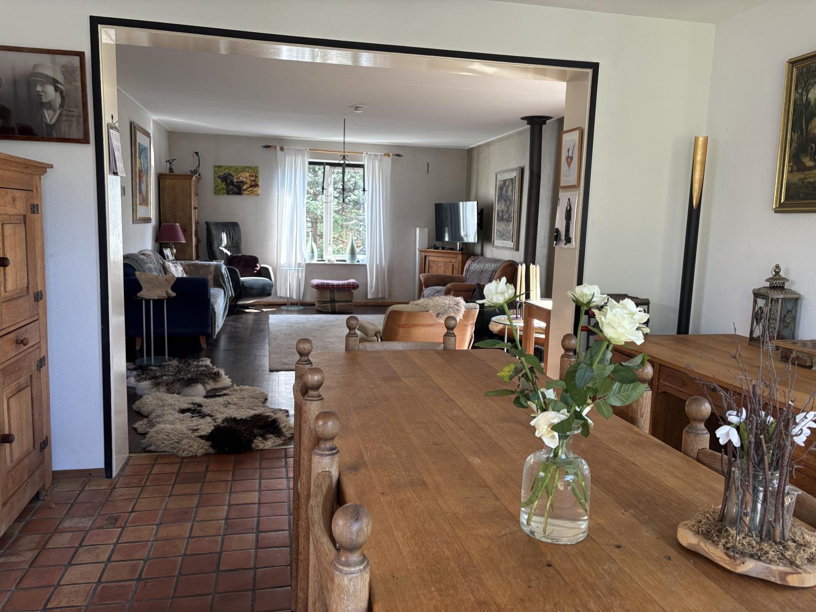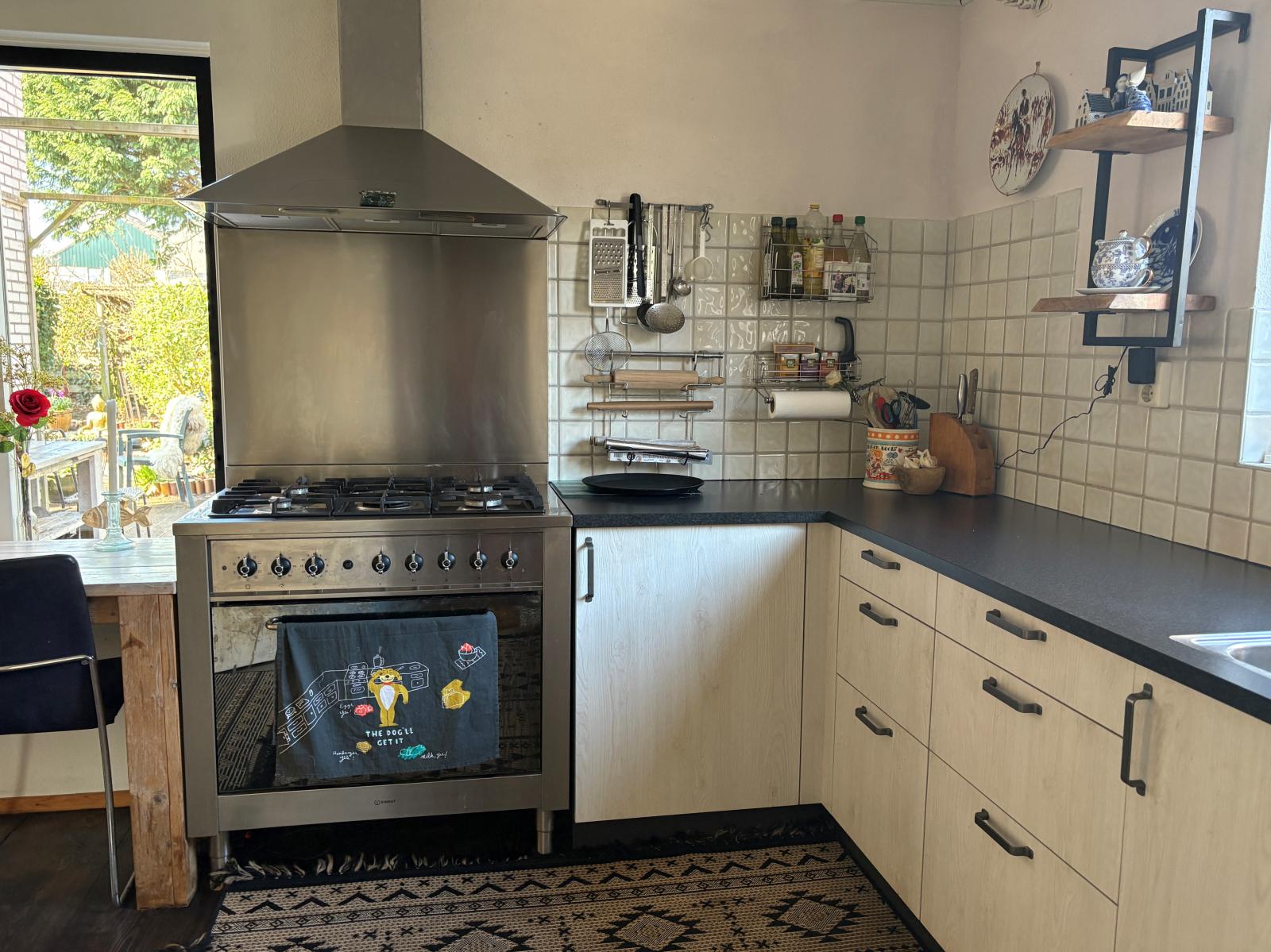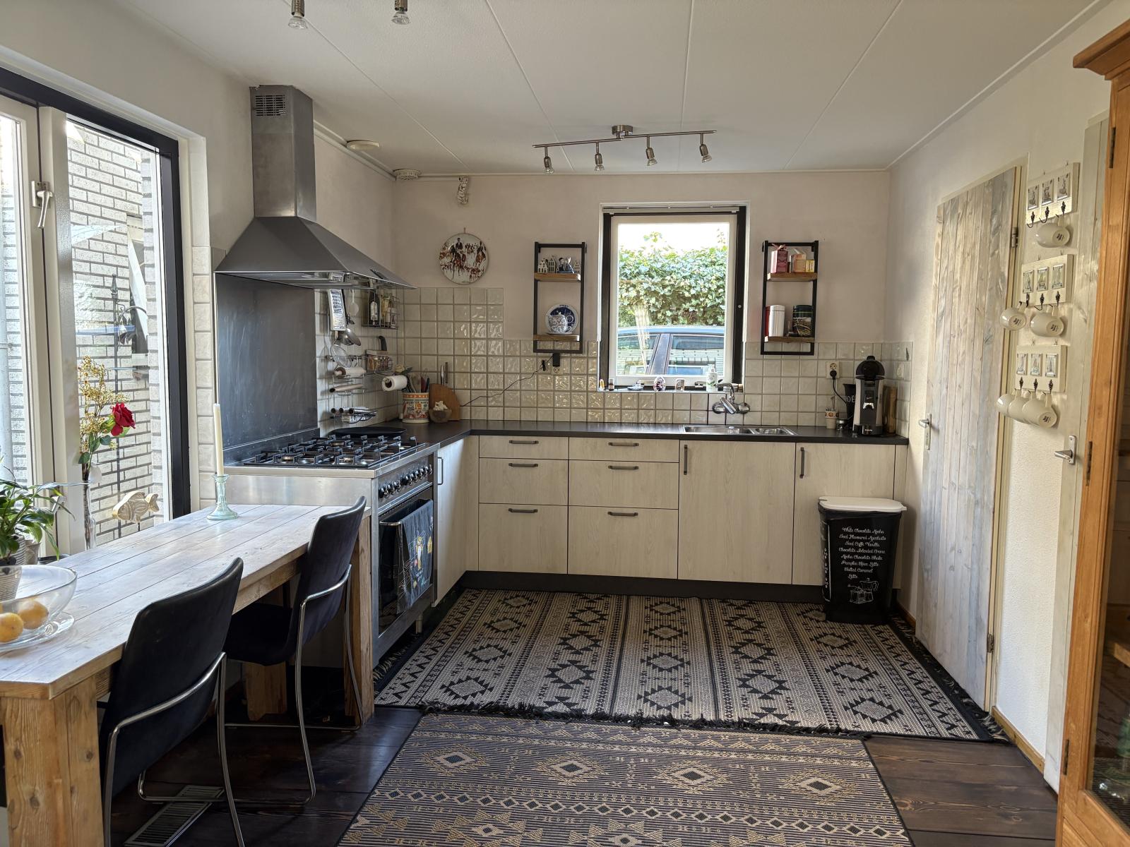 De ruime zithoek bevindt zich aan de voorzijde, terwijl de eethoek aan de achterzijde ligt en uitzicht biedt op de fraai aangelegde tuin, die via de schuifpui bereikbaar is.