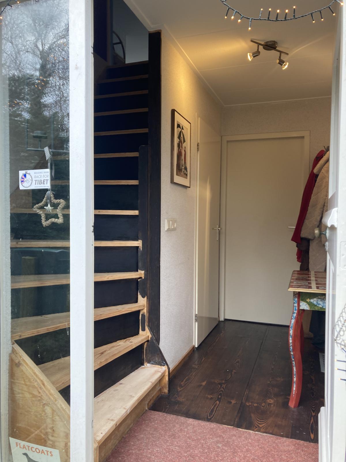 Entree in hal met meterkast, trapopgang, toilet en toegang tot het woongedeelte.