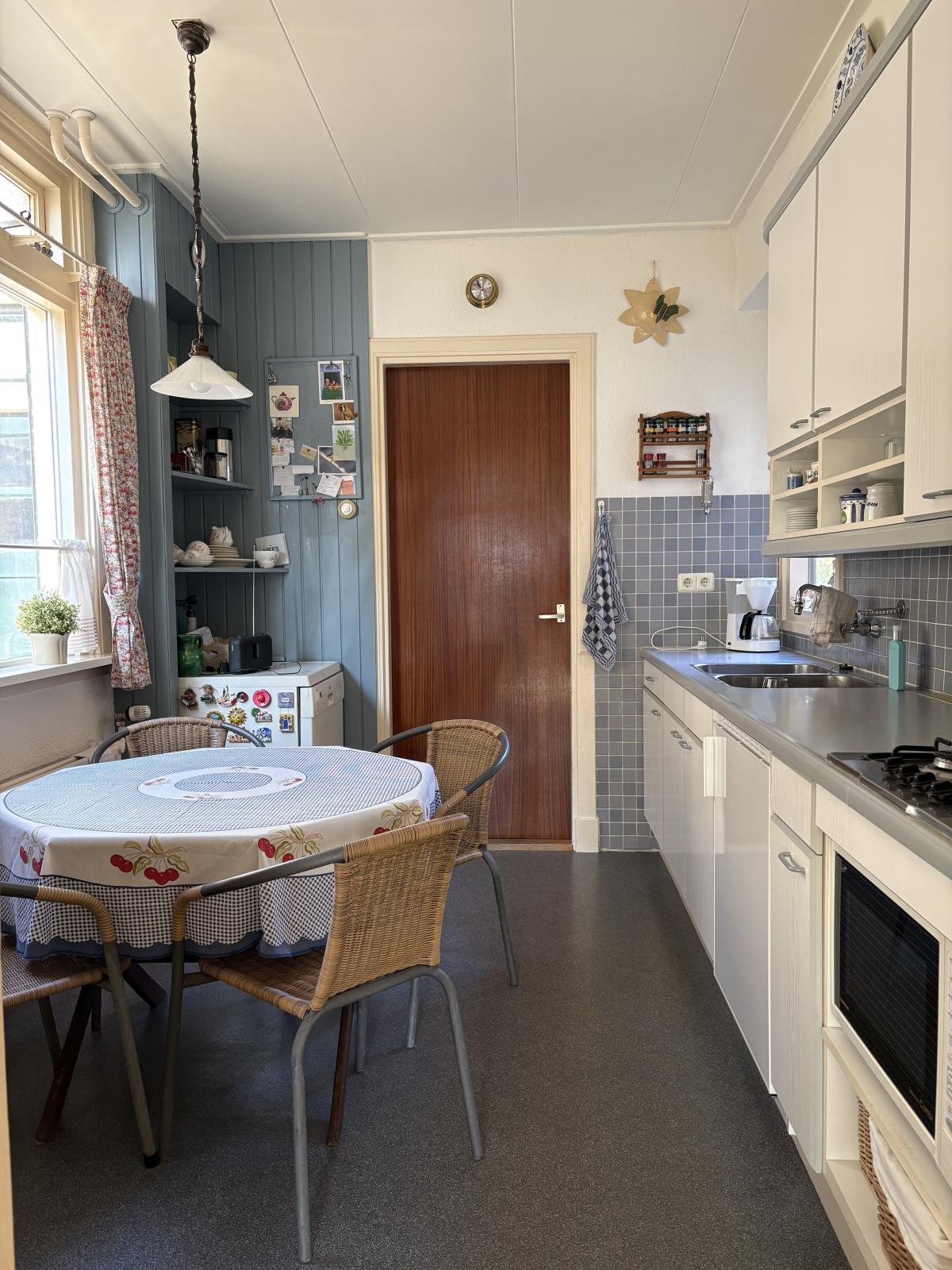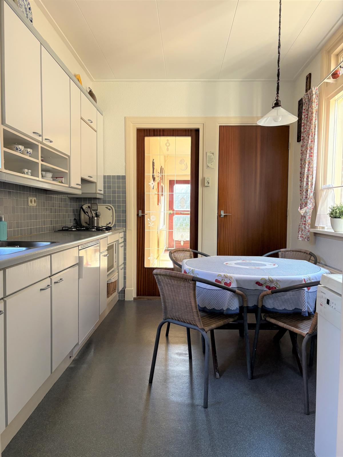 De gesloten keuken met eigen raampartij zorgt voor een heldere en licht uitstraling. Je komt in een nette keuken met veel kastruimte en de nodige inbouwapparatuur zoals een koelkast, combi-oven en 4-pits gaskookplaat. Tevens is hier ook de kelder bereikbaar (gesitueerd onder de trap).