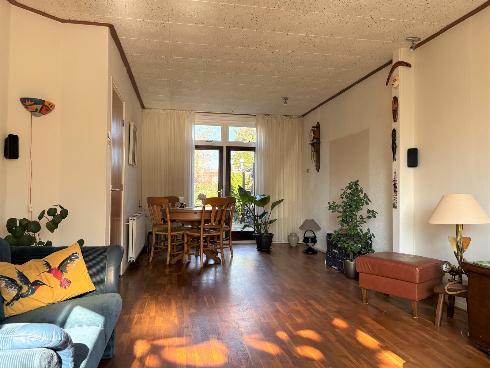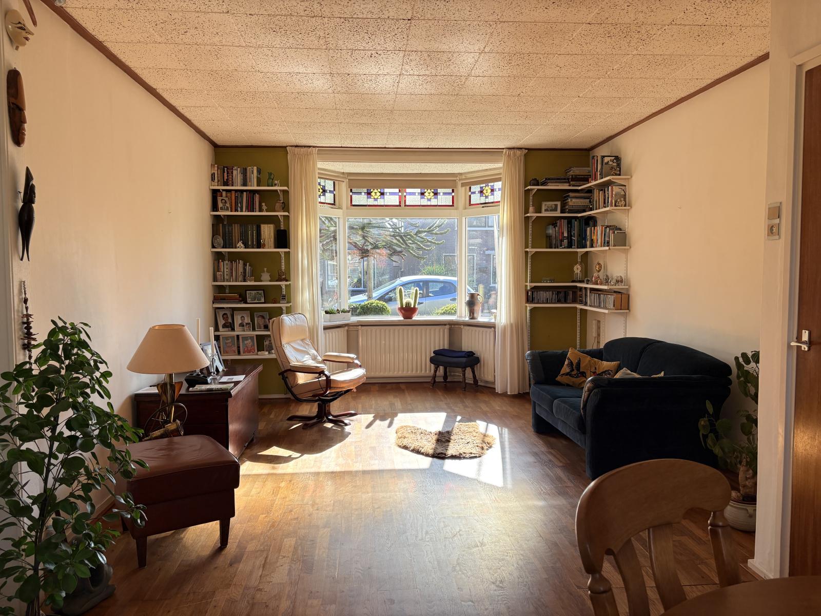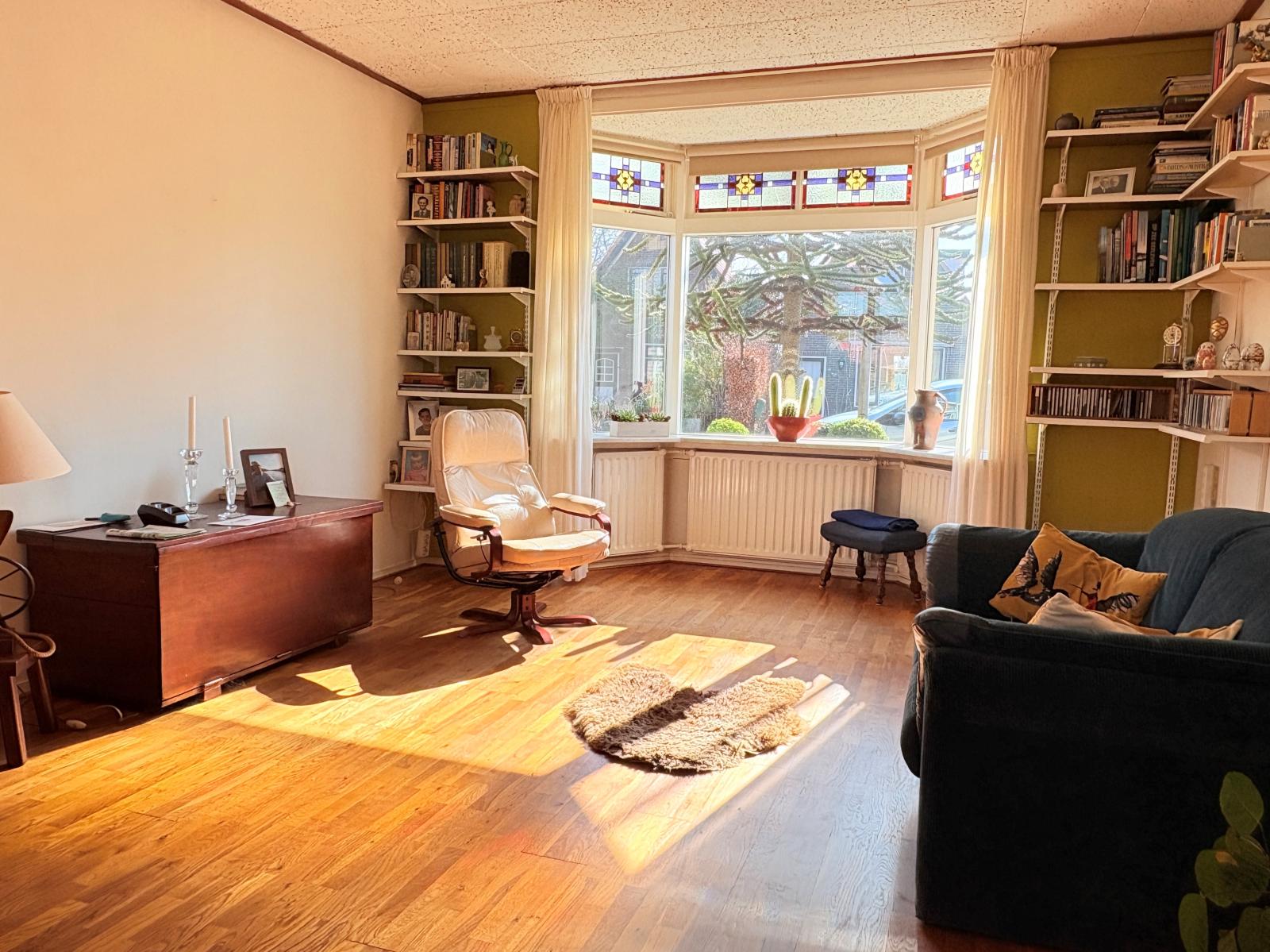 Via de statige entree en ruime hal kom je in de royale woonkamer welke nog een authentieke sfeer heeft. De erker met glas-in-lood ramen zorgt voor ruim voldoende lichtinval. Via de openslaande deuren is de achtertuin bereikbaar.