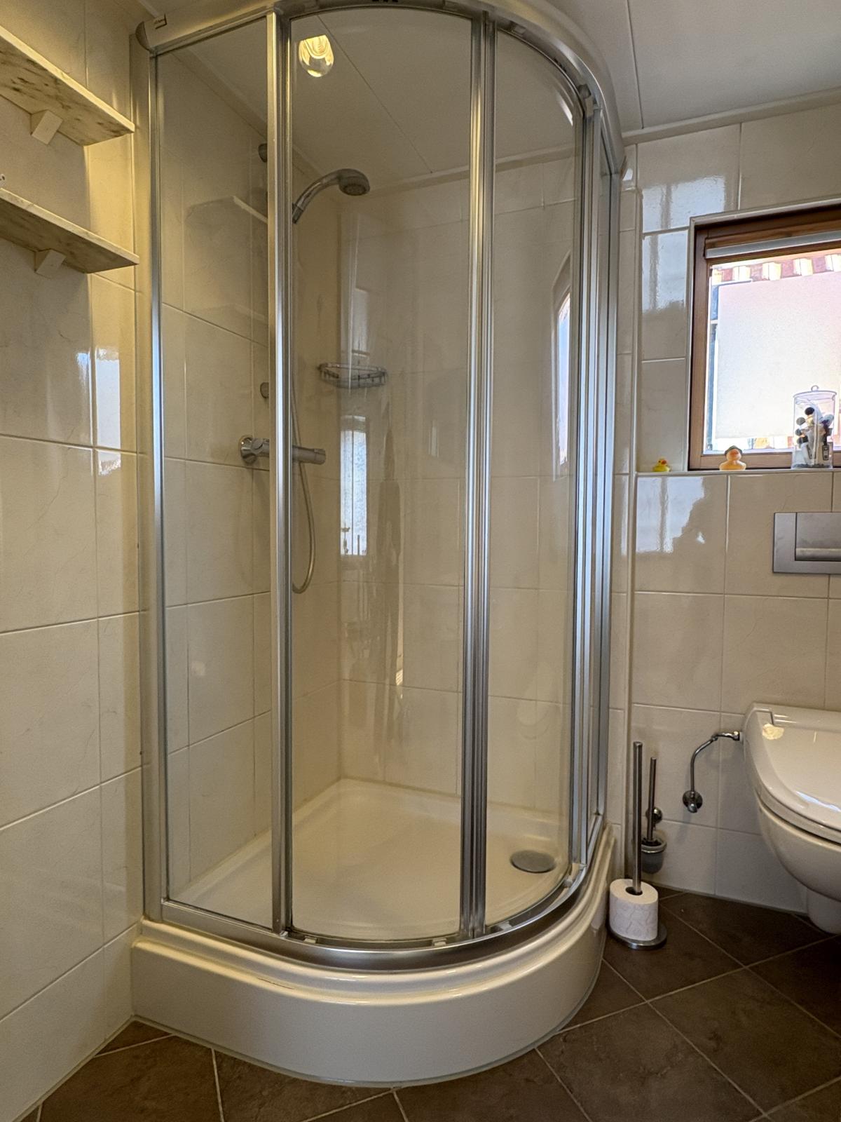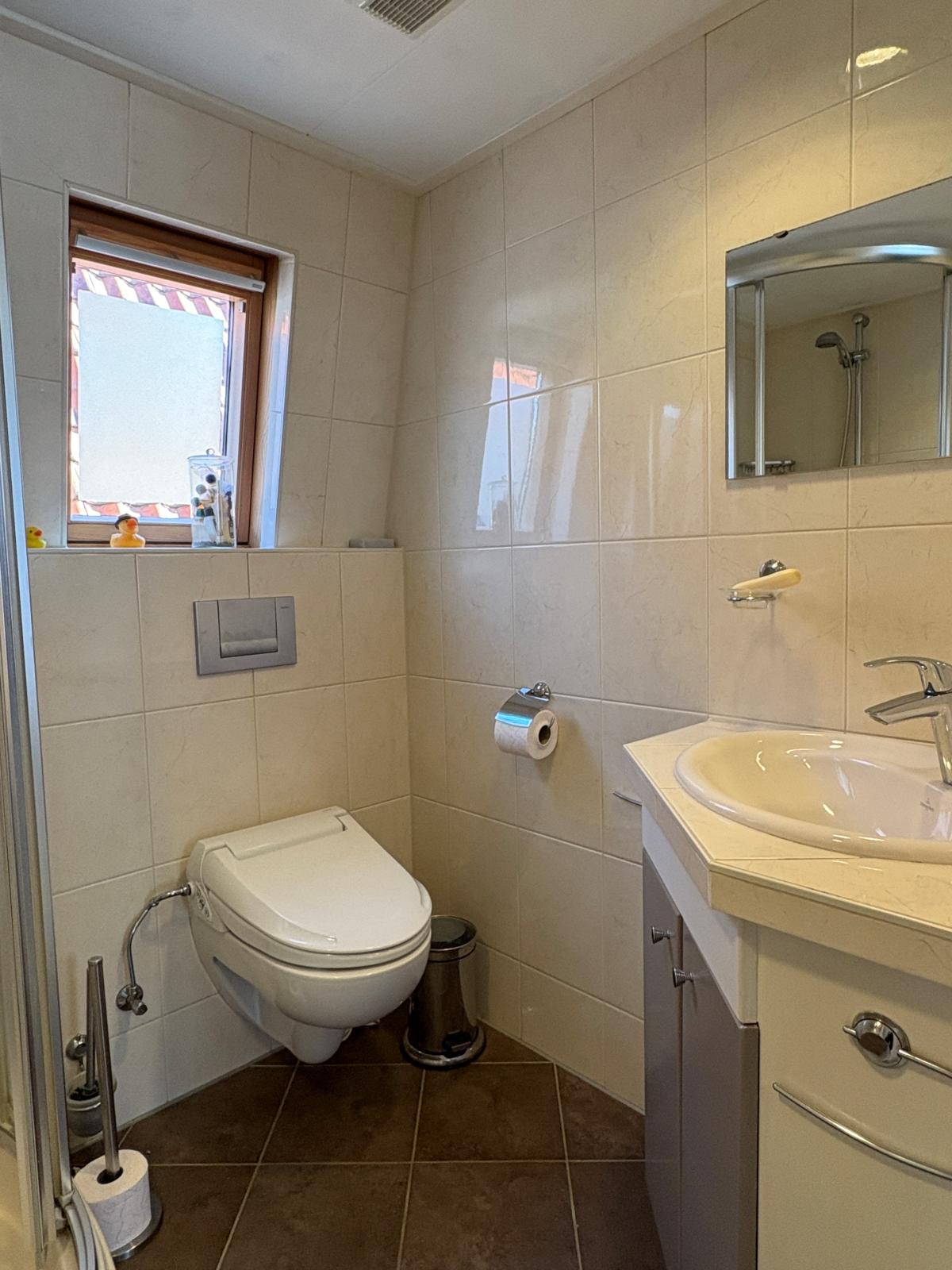 De badkamer is ingericht met een douchecabine, toilet en wastafel met meubel.