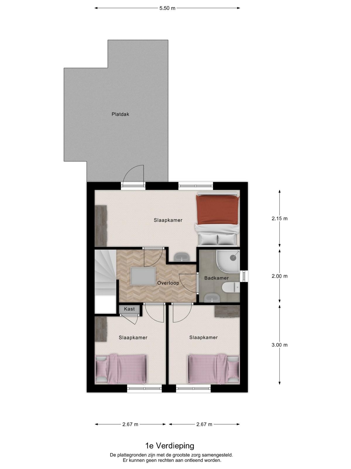 De eerste verdieping heeft een ruime overloop en biedt één grote slaapkamer en twee kleinere (waarvan twee met vaste kast).